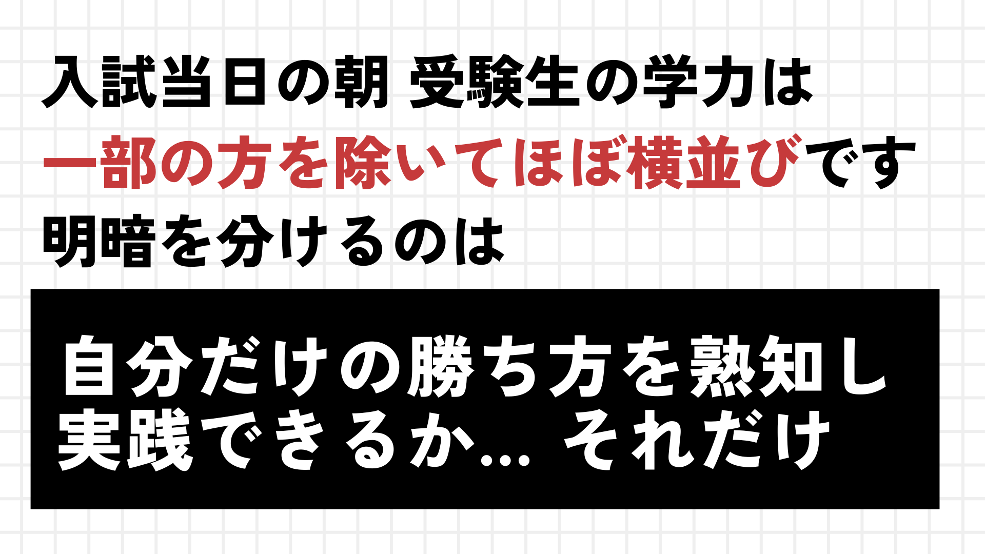 大一番で100%の実力を出し切るのは大人でも難しいこと。12歳ならなおさらです。重圧・短期決戦による心身の疲労から家の実力の2〜3割減となる受験生がほとんどの中、競り勝つ子は下げ幅を1割減に留めています。