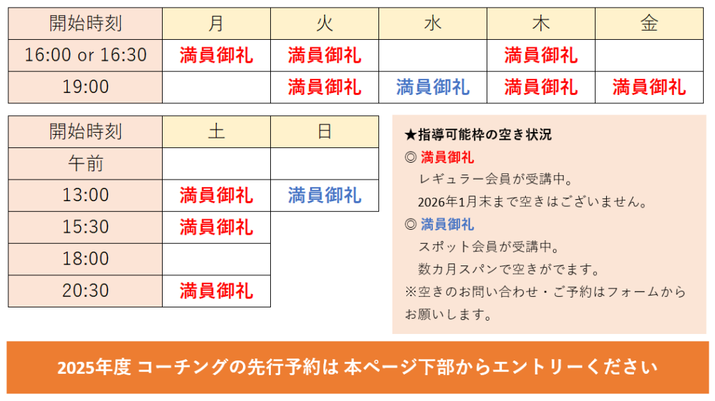 2025年度パーソナルコーチング 指導可能枠